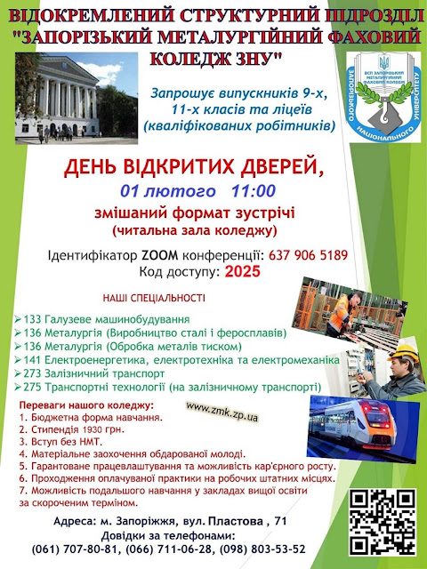❗Увага❗ 01.02.2025 р об 11:00 - День відкритих дверей у ВСП "Запорізький металургійний фаховий коледж ЗНУ"
